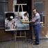 Ein Mann mit Waffe posiert nach erfolgreicher „Jagd“ vor den Trophäen seiner Leidenschaft. Nur, dass die Erlegten Bilder, die Waffe eine Schussfunktion vortäuschendes Objekt und der Jäger ein Bewohner des Hauses, indem sich das Atelier befindet, sind.